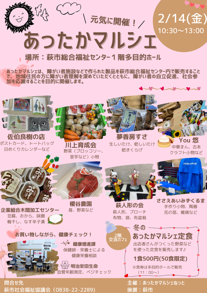 障がいのある方や、萩市内の障がい福祉施設で作られた新鮮な野菜や小物、雑貨などを販売します。健康栄養相談コーナーもあり、身体のことについてお気軽にご相談いただけます。