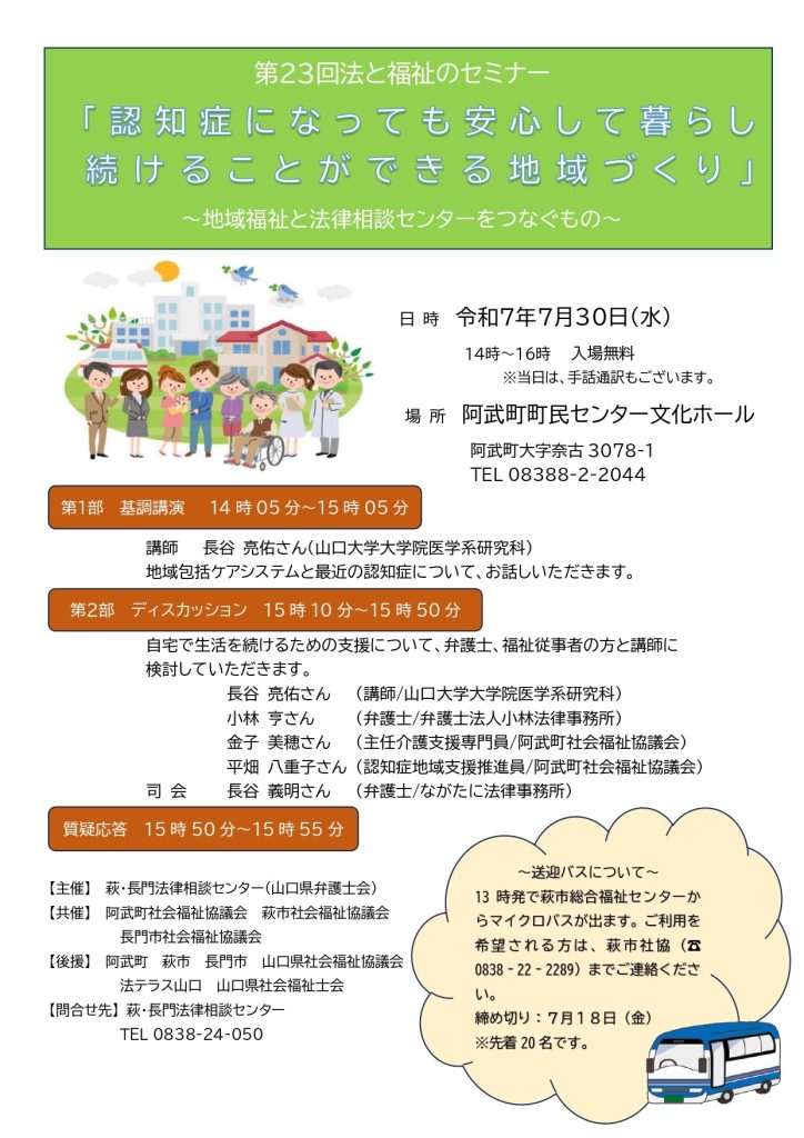 平成14年から、地域福祉と法律相談センターをつなぐものとして、萩・長門法律相談センターが主催となり、社会福祉協議会や消費生活センターも協力し、身近で法と福祉の双方に関わる問題を取り上げ市民の皆さんと一緒にその解決の道筋を考える「法と福祉のセミナー」を年1回実施しています。