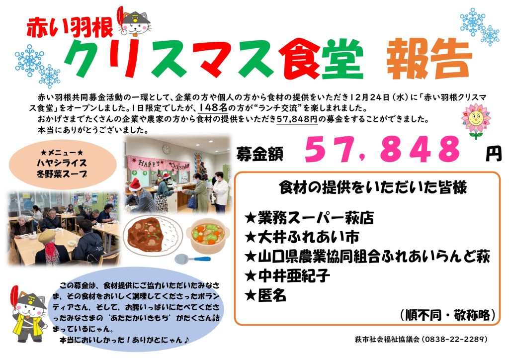 赤い羽根共同募金活動の一環として、企業の方や個人の方から食材の提供をいただき12月24日(水)に「赤い羽根クリスマス食堂」をオープンしました。1日限定でしたが、148名の方が“ランチ交流”を楽しまれ、おかげさまでたくさんの企業や農家の方から食材の提供をいただき、57,848円の募金をすることができました。 ご協力ありがとうございました。
